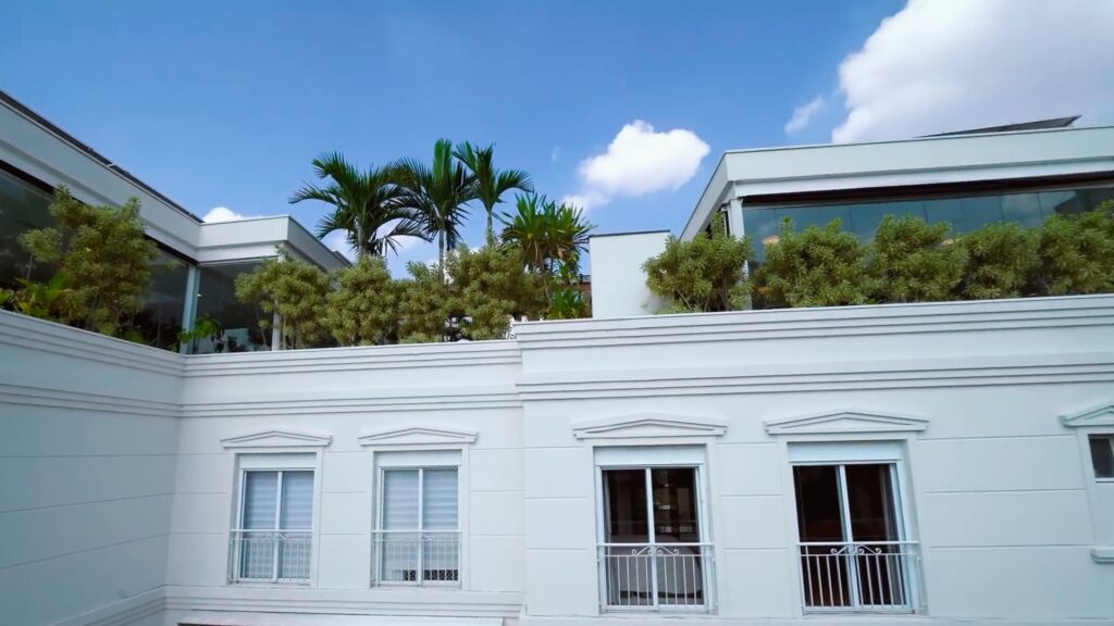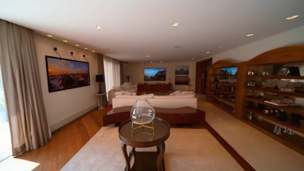 Localizada em um dos bairros mais exclusivos de São Paulo, a mansão oferece tudo o que um morador pode imaginar em termos de luxo e conforto. No piso térreo, há uma ampla sala de estar com vários ambientes integrada a uma sala de jantar elegante e uma cozinha gourmet. No mesmo espaço há uma adega climatizada para 200 garrafas com vista para a sala de estar.