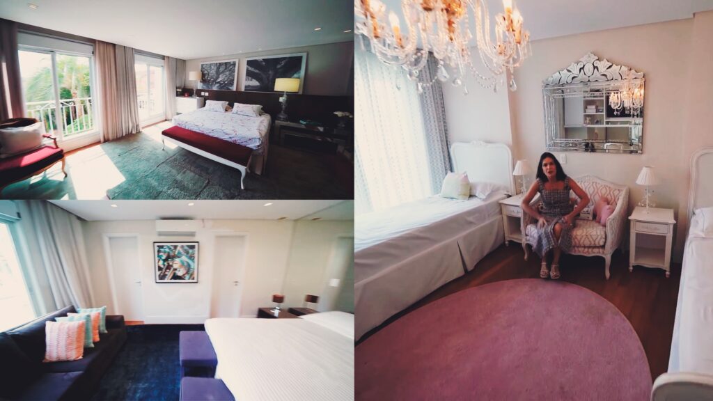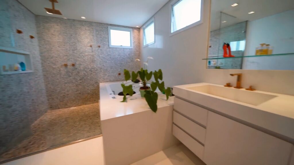 Ao todo, são quatro suítes, todas com decorações personalizadas. O destaque, claro, vai para a suíte principal, que com dois closets, e uma sala de banho privativa com jacuzzi. A área externa também é uma atração à parte e conta com piscina, deck de madeira com SPA, espaço com lareira, jardim de inverno, e um grande espaço gourmet com churrasqueira, máquinas de gelo, forno de pizza, fogão a lenha, chopeira e muito espaço para acomodar seus convidados.