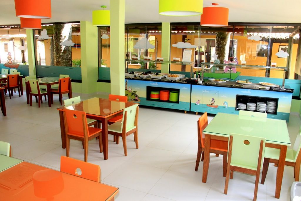 No novo restaurante do resort, as cadeiras são menores, assim como as mesas, sendo perfeitas para acomodar os baixinhos. O ambiente é todo colorido e criativo para que a criançada possa se divertir enquanto degusta os pratos da gastronomia nacional e internacional. A culinária do local também é especial, pois é preparada sem condimentos industrializados, contando com opções saudáveis e divertidas.
