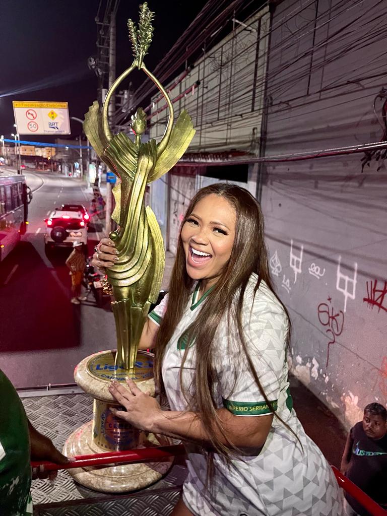“Somos campeões da Série Ouro. Ano que vem, a gente se vê no Grupo Especial na Sapucaí. Agradeço de todo meu coração ao Mestre Vitinho, que a todo momento confiou em mim. E agora podemos gritar ‘somos campeões’ a todos os meus ritmistas e, principalmente, ao meu presidente Sandro Avelar e minha primeira dama, que nunca largaram a minha mão”, disse a rainha de bateria.
