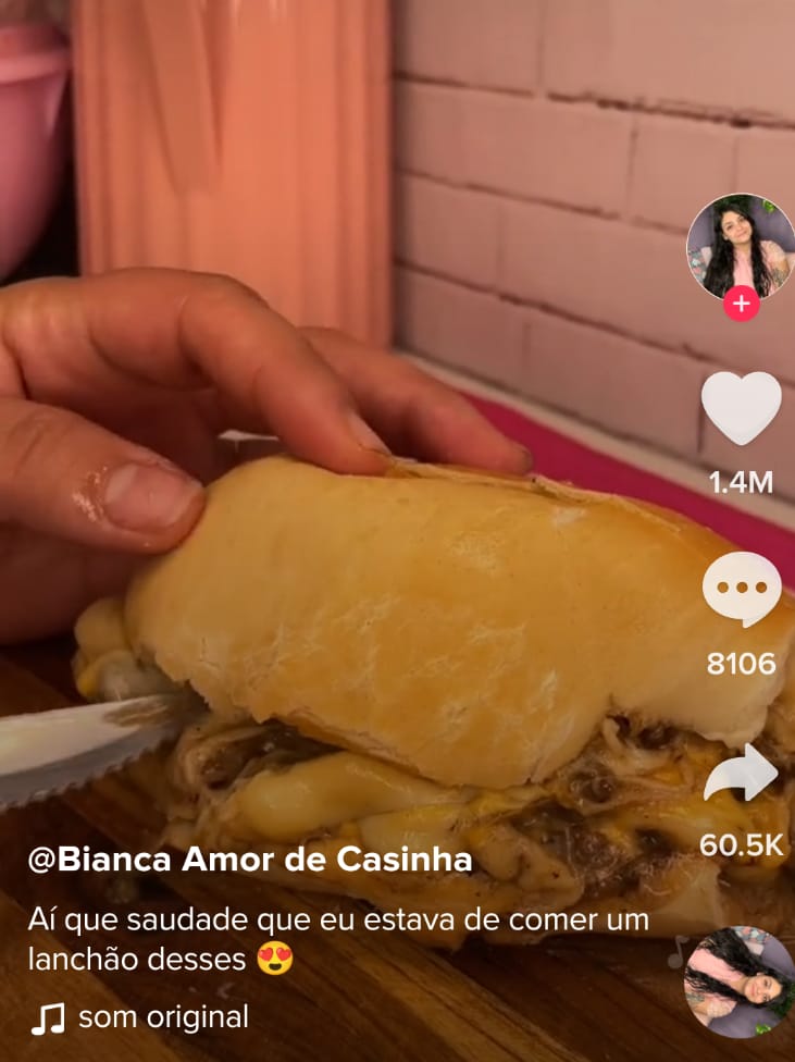 O lanchão da @bianca_amordecasinha com pão, carne, vinagrete e muito queijo, ultrapassou 1.4 milhões de curtidas. “Olha, gente. Nem coube no pão!”, exclamou a criadora durante o vídeo.