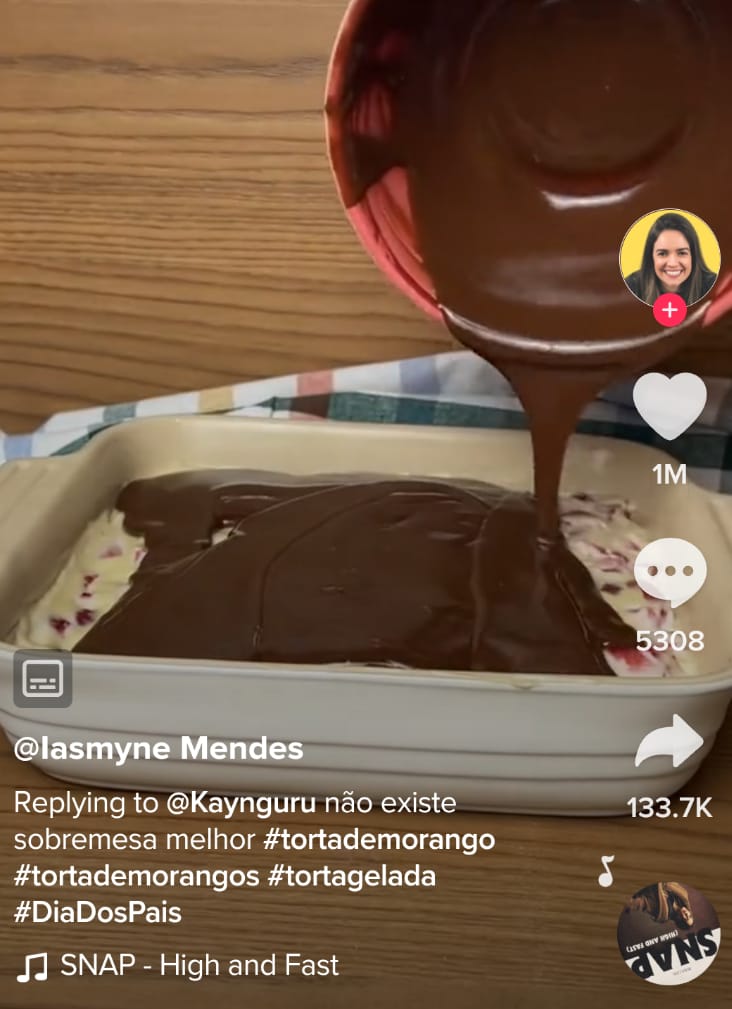A torta de morango com chocolate da @iasmyneperdigao também atingiu 1 milhão de curtidas. E é aquele combo de sucesso: uma receita de fácil reprodução, com ingredientes populares e de dar água na boca. “Olha a cremosidade disso!”, diz a criadora durante o vídeo.