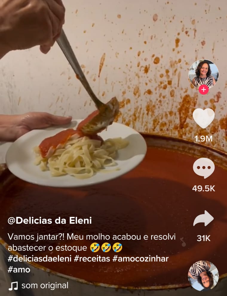Macarrão da Eleni foi o recorde de curtidas, vídeo com quantidade inusitada de molho já ultrapassa 1.9 milhões de curtidas