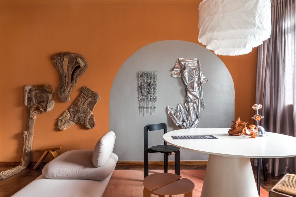 A sala recebeu a cor do ano de 2023 da Suvinil, Calcita Alaranjada. Créditos: Ohma Design