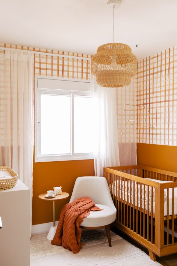 Neste quarto de bebê, a cor Calcita Alaranjada foi utilizada para demarcar a parte de baixo da parede ao delimitar os espaços do berço e cômoda, ótima estratégia para ambientes menores, que precisam de funcionalidade. Combinada com um papel de parede que segue na mesma linha de tons terrosos, a cor trouxe equilíbrio ao ambiente. Os móveis mais clássicos, em madeira, contribuem para essa sensação.