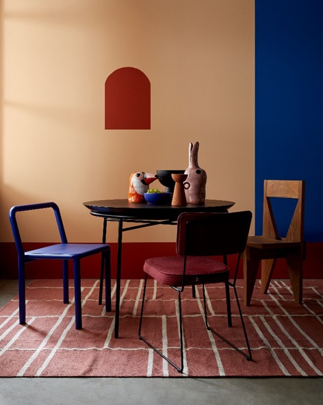 Base Soft, Terra Molhada e Magia Azul são as tonalidades que fazem parte desse ambiente. A pintura geométrica, uma tendência que se mantém em alta no universo da decoração, foi utilizada para criar um desenho na parede e deixar o espaço em um mood mais descontraído. As cadeiras em volta da mesa apresentam cores que se assemelham as que foram trazidas ao fundo e proporcionam uma sensação de continuidade, agradando aos olhos.