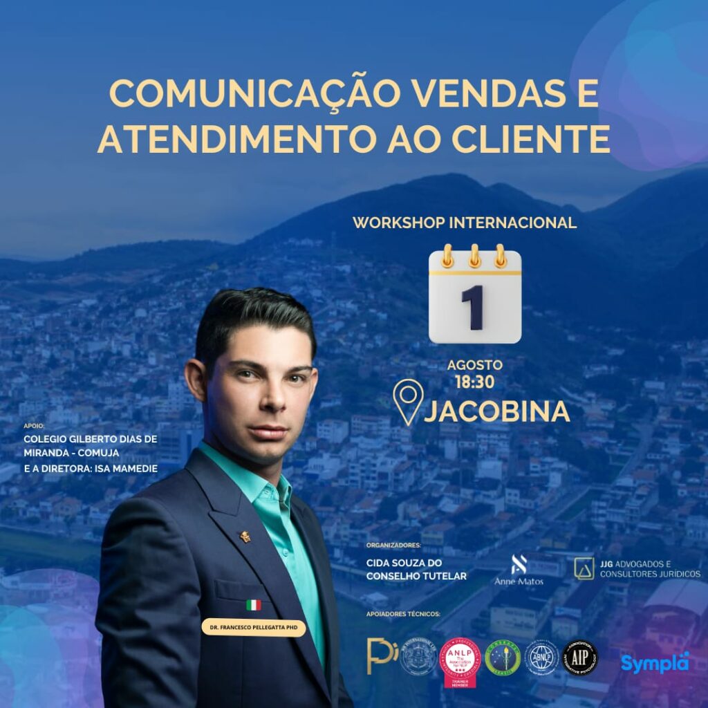 A cidade de Jacobina (BA), terá o privilégio de receber um evento que promete aprimorar habilidades de comunicação, vendas e atendimento ao cliente de forma acelerada no dia 1º de agosto de 2023: o Workshop de Comunicação, Vendas e Atendimento ao Cliente. O renomado palestrante e Master Trainer de Programação Neuro-Linguística (PNL), Francesco Pellegatta, estará à frente do evento, oferecendo aos participantes a oportunidade única de adquirir conhecimentos valiosos e aplicáveis em suas vidas pessoais e profissionais.