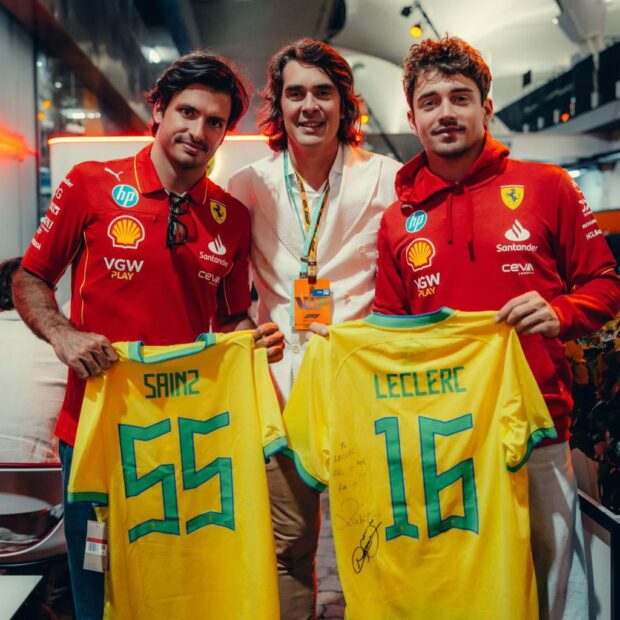 Em um cenário onde a adrenalina e a velocidade tomaram conta de São Paulo, Diego Fernandes, CEO da O8 Partners, trouxe um toque de surpresa e emoção ao GP de Fórmula 1 em Interlagos. No meio da atmosfera eletrizante das corridas, Fernandes presenteou os pilotos da Scuderia Ferrari, Carlos Sainz e Charles Leclerc, com camisas autografadas da Seleção Brasileira, personalizadas pelos craques Neymar Jr. e Rodrygo Goes. Esse gesto especial simbolizou uma ponte entre duas das paixões mais fervorosas do esporte: o futebol e a Fórmula 1.