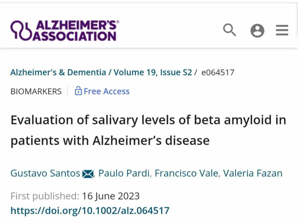 O estudo entitulado “Evaluation of Salivary levels of beta amyloid in patients with Alzheimer’s disease” (Avaliação dos níveis salivares de beta-amilóide em pacientes com doença de Alzheimer, em tradução livre), foi publicado na edição de junho da Alzheimer & Dementia, a mais importante Revista Científica especializada em Alzheimer.