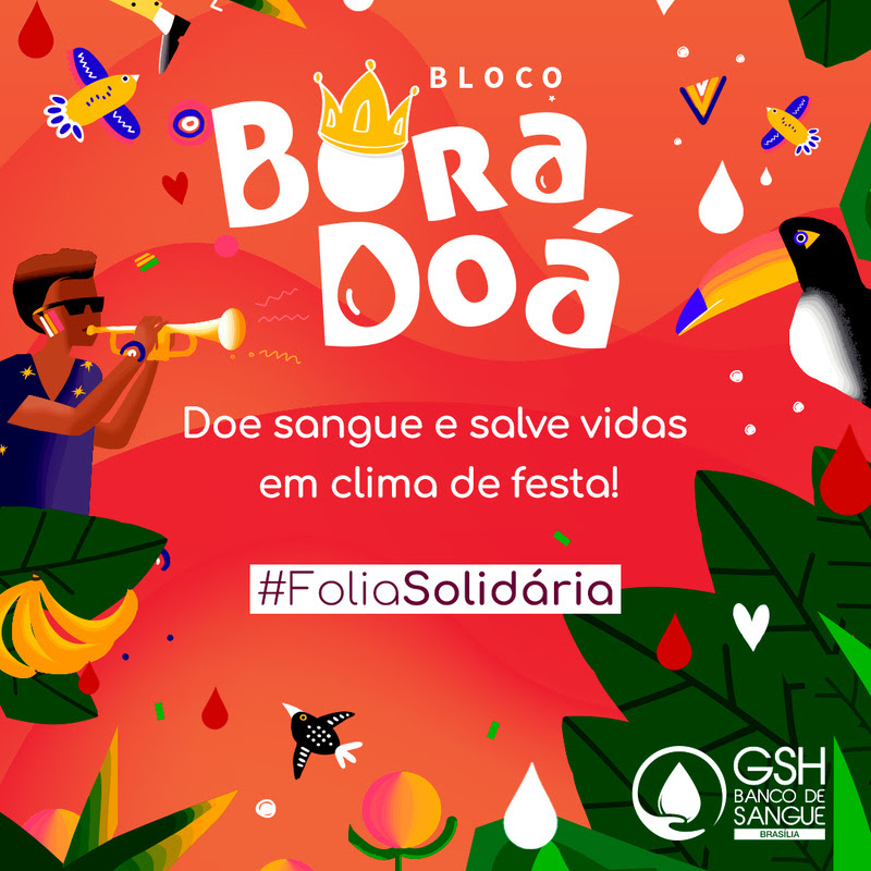 Mesmo com as festas de Carnaval suspensas, o Banco de Sangue entra no clima e convida os doadores a colocarem o bloco da solidariedade nas suas redes sociais com a campanha “Bora Doá #FoliaSolidaria”, e faz um apelo para que as pessoas aproveitem esse período, em que muitos estarão em recesso de trabalho, para reservarem um tempinho para doarem sangue.