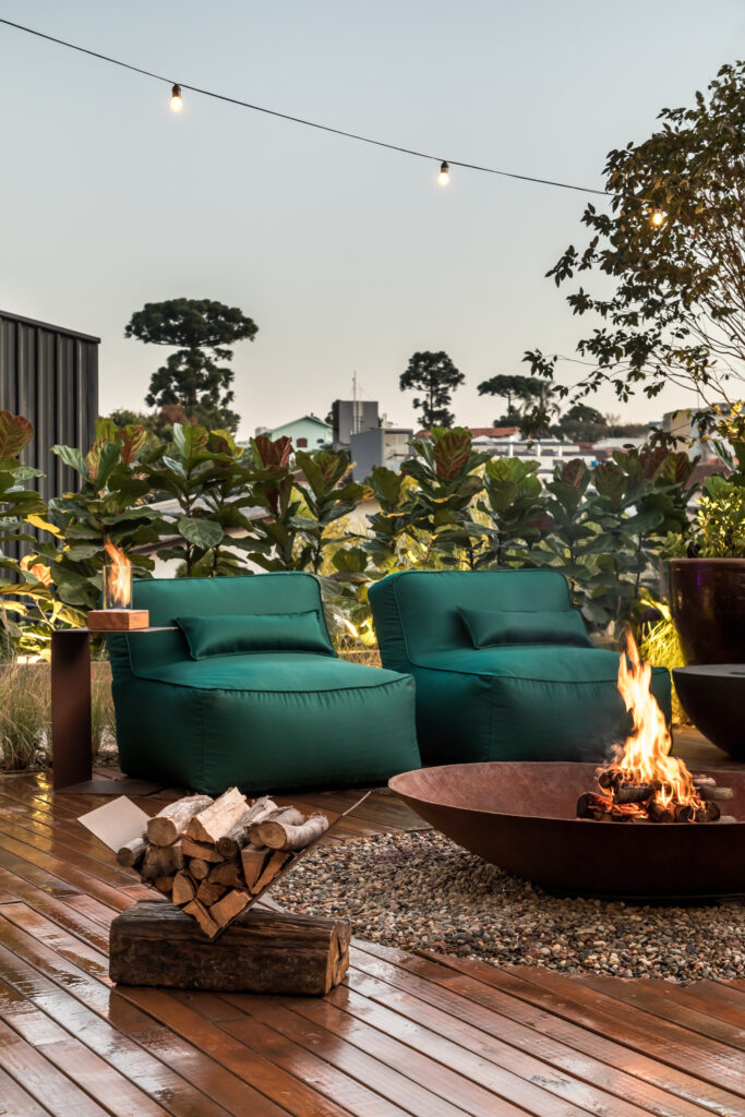 Em seu Fireplace, que combina os puffs do modelo “Joy” na cor verde musgo, e a lareira central “Tacho Corten”, cria-se uma sensação de aconchego. Pensados para uma experiência externa, os puffs são impermeáveis, possuem proteção UV, tecnologia antimofo e antiviral. Destacam-se também o “Sofá Modular”, os “Almofadões de Inverno” e a poltrona “Hype”, destacada sob a base flutuante no espaço ”instagramável”.
