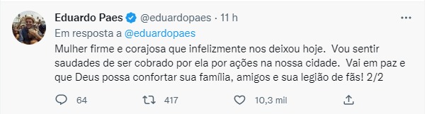 Ele complementou dizendo que ela era uma mulher firme e corajosa. Assim, como grande parte do público, Paes destacou que sentirá falta dela cobrando ações de políticas públicas na cidade. “Vai em paz e que Deus possa confortar sua família, amigos e sua legião de fãs!”, finalizou.