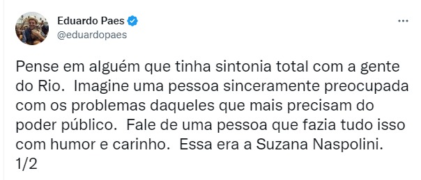 Ele usou as redes sociais ainda na noite da última terça-feira (25) para homenagear a repórter. “Pense em alguém que tinha sintonia total com a gente do Rio. Imagine uma pessoa sinceramente preocupada com os problemas daqueles que mais precisam do poder público. Fale de uma pessoa que fazia tudo isso com humor e carinho. Essa era a Suzana Naspolini”, escreveu em seu perfil no Twitter.