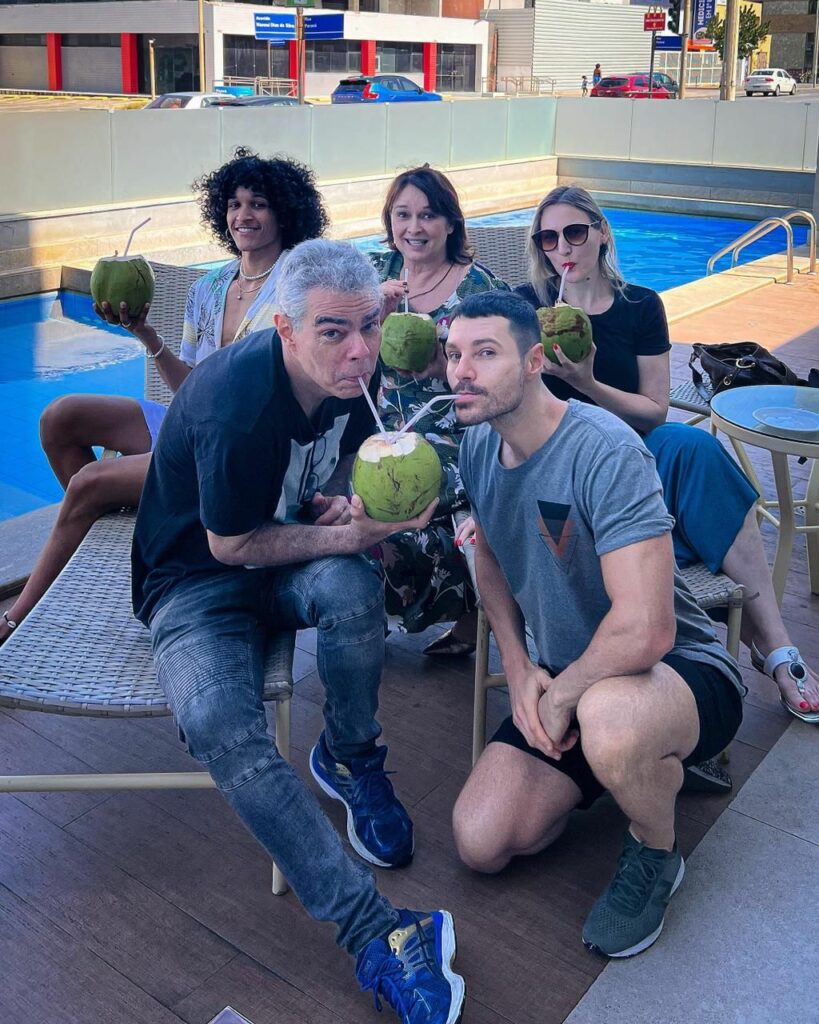 Em clima de descontração Myrian Rios, Nizo Neto, Murilo Cunha ,Mari Feil e o assistente Nicolas fizeram um click no hall da piscina do hotel onde ficaram hospedados, saboreando uma deliciosa água de coco.