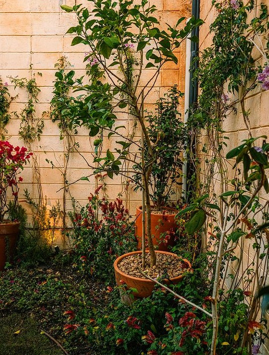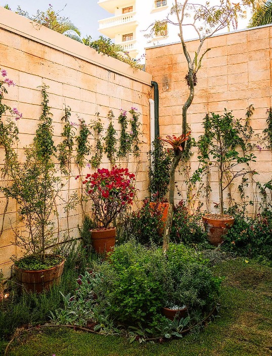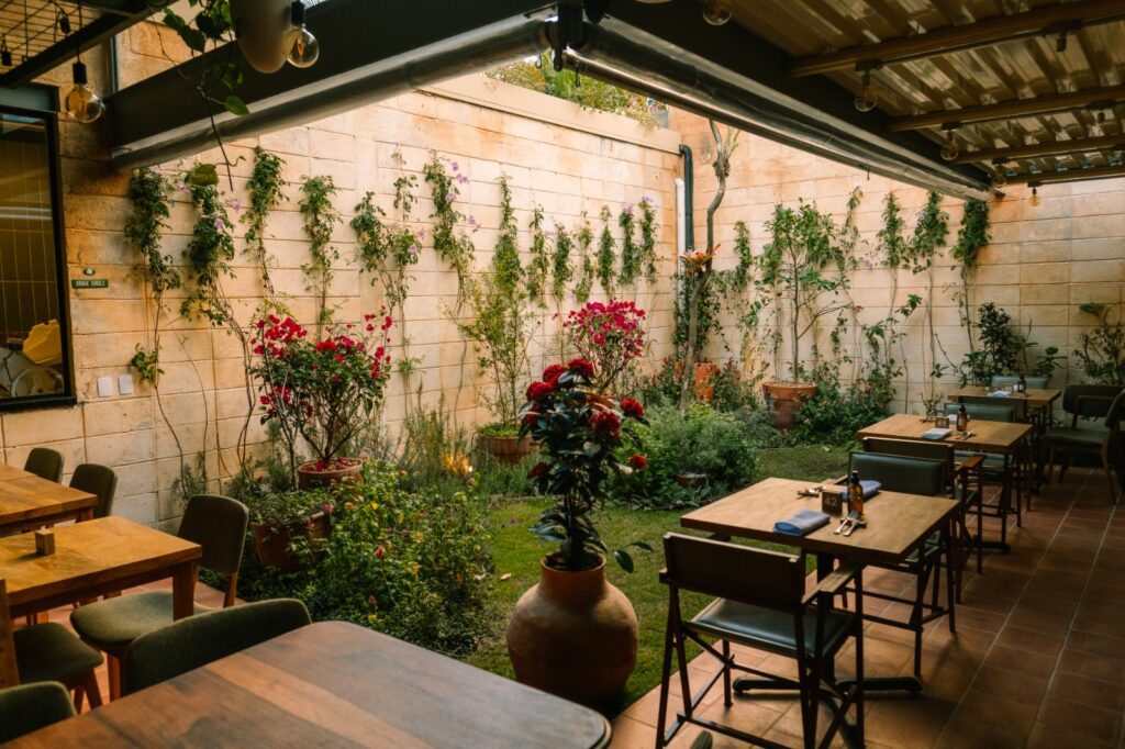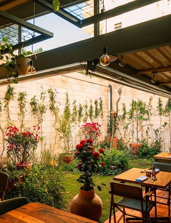 A área que anteriormente era ocupada pela piscina da casa ao lado agora abriga vasos com flores e espécies típicas de horta, como alecrim, peixinho e manjericão. Essas plantas garantem ao chef Marcelo Laskani os aromas clássicos das receitas italianas, tornando a experiência gastronômica ainda mais autêntica.