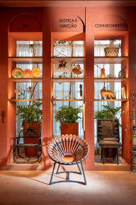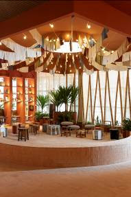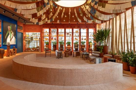 Os pisos cerâmicos da Lepri, presentes no ambiente, foram escolhidos para referenciar os materiais e tonalidades usados nos quintais e terreiros. “A grande celebração do projeto é a terra, a terra batida, o pisar forte no chão. Por isso, o fato de ter uma materialidade que provém literalmente da terra e do barro nesta grande parceria com a Lepri”, destaca Salles.