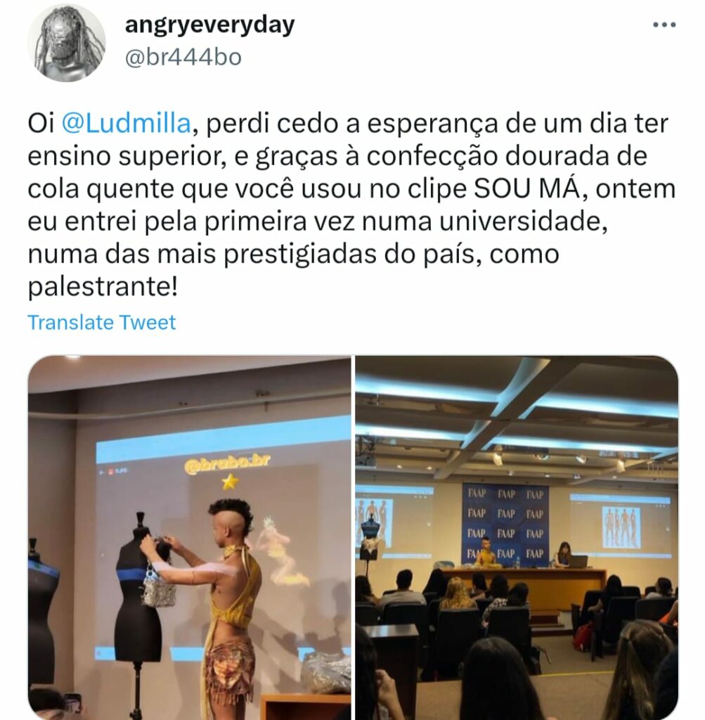 Em sua conta oficial na rede social Twitter, o estilista se emocionou ao dizer que desistiu cedo do sonho de cursar nível superior, mas a visibilidade que Ludmilla trouxe mudou seu destino. “Oi, @ludmilla . Perdi cedo a esperança de um dia ter ensino superior, e graças a confecção dourada de cola quente que você usou no clipe Sou Má, ontem eu entrei pela primeira vez num universidade, numa das mais prestigiadas do país, como palestrante”, escreveu enquanto mencionava a cantora.