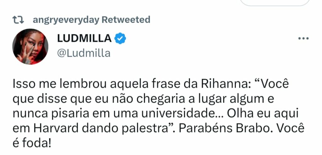 Ludmilla não perdeu a oportunidade de enaltecer o trabalho de Elton. Retweetou o tweet do estilista pela sua conta oficial e ainda comentou: “Isso me lembrou aquela fase da Rihanna: ‘Você que disse que eu não chegaria a lugar algum e nunca pisaria em uma universidade… Olha eu aqui em Haward dando palestra’. Parabéns, brabo! Você é foda”, declarou a cantora.