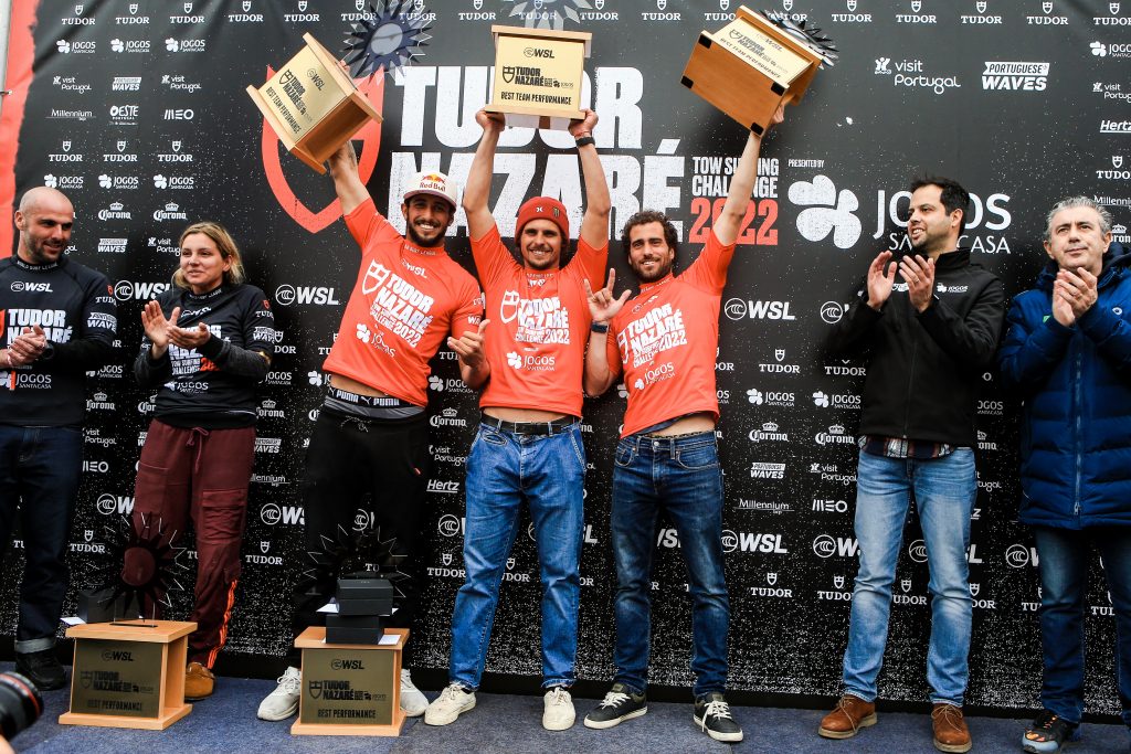 NAZARE, PORTUGAL – FEBRUARY 10: Lucas Chianca of Brazil , Nic Von Rupp of Portugal and Tony win the Best Team Performance surfs in Heat of Round 1 at the TUDOR Nazaré Tow Surfing Challenge presented by Jogos Santa Casa on February 10, 2022 in Nazare, Portugal. (Photo by Laurent Masurel/World Surf League)