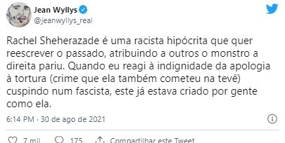 “Rachel Sheherazade é uma racista hipócrita que quer reescrever o passado, atribuindo o monstro a direito pariu. Quando eu reagi à indignidade da apologia à tortura (crime que ela também cometeu na tevê) cuspindo num fascista, este já estava criado por gente como ela .”
