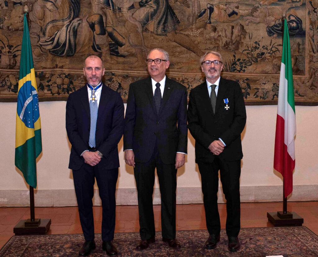 O presidente do grupo TIM, Pietro Labriola, e o vice-presidente da TIM Brasil, Mario Girasole, receberam a condecoração da Ordem do Rio Branco, honraria concedida pelo Itamarati, em cerimônia realizada na última quinta-feira (9), no Palazzo Pamphilj, sede da Embaixada do Brasil em Roma.