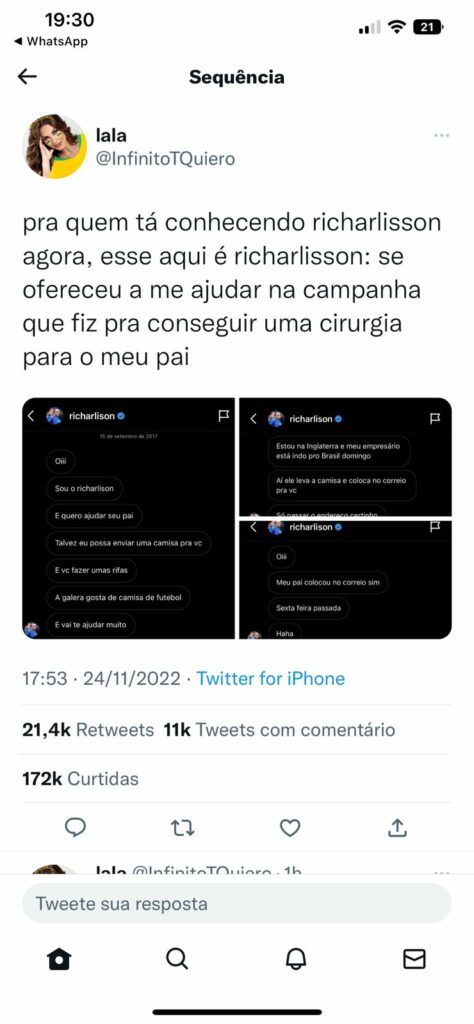 Em sua rede social twitter, Laryssa relembrou o momento em que recebeu apoio de Richarlison na campanha em prol da cirurgia de seu pai. A ocasião foi em 2017, para mostrar que as boas ações do jogador não são de hoje