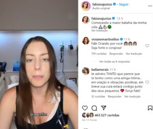 Em um vídeo emocionante publicado em seu Instagram, Fabiana compartilhou seus sentimentos e a descoberta da doença. “Obviamente tem momento que fico mais baqueada. Ainda não entendi totalmente o que está acontecendo. Quando acordo aqui no hospital lembro que isso é verdade. Porque, até então, às vezes vem o sentimento que ‘estou num pesadelo. Vou acordar e não vai ser isso’. Mas infelizmente é o que tem pra hoje e preciso lutar e vencer. E tenho certeza que vou. E esse choro é de confiança”, desabafou a influencer.