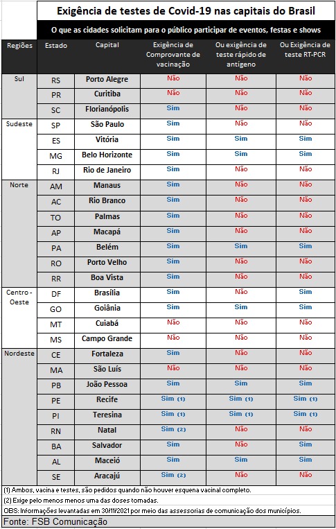 De acordo com um levantamento, entre às 27 capitais do país, 12 cidades exigem apenas vacinação; 10 solicitam testagem quando há ausência de vacinação ou imunização incompleta; e cinco capitais não solicitam comprovante de vacinação e nem testes: Campo Grande, Curitiba, Cuiabá, Porto Alegre e São Luís. Nestas cidades, os organizadores dos eventos ficam livres para fazerem ou não exigências de testes ou vacinação.