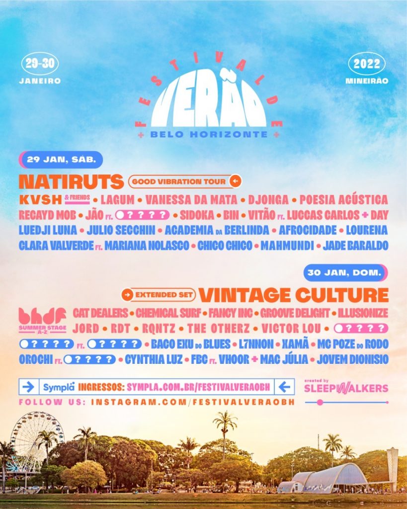O Festival de Verão de Belo Horizonte apresenta, em dois dias de festa, mais de 50 artistas de vários gêneros musicais da cena nacional em três palcos. O evento, dos mesmos realizadores do Festival Planeta Brasil, traz a pluralidade musical com Vintage Culture, Natiruts, Vanessa da Mata, Jão, Djonga, Xamã, MC Poze do Rodo, Lagum, Luedji Luna, KVSH, Chico Chico e tantos outros artistas confirmados. O festival acontece nos dias 29 e 30 de janeiro no estádio do Mineirão.