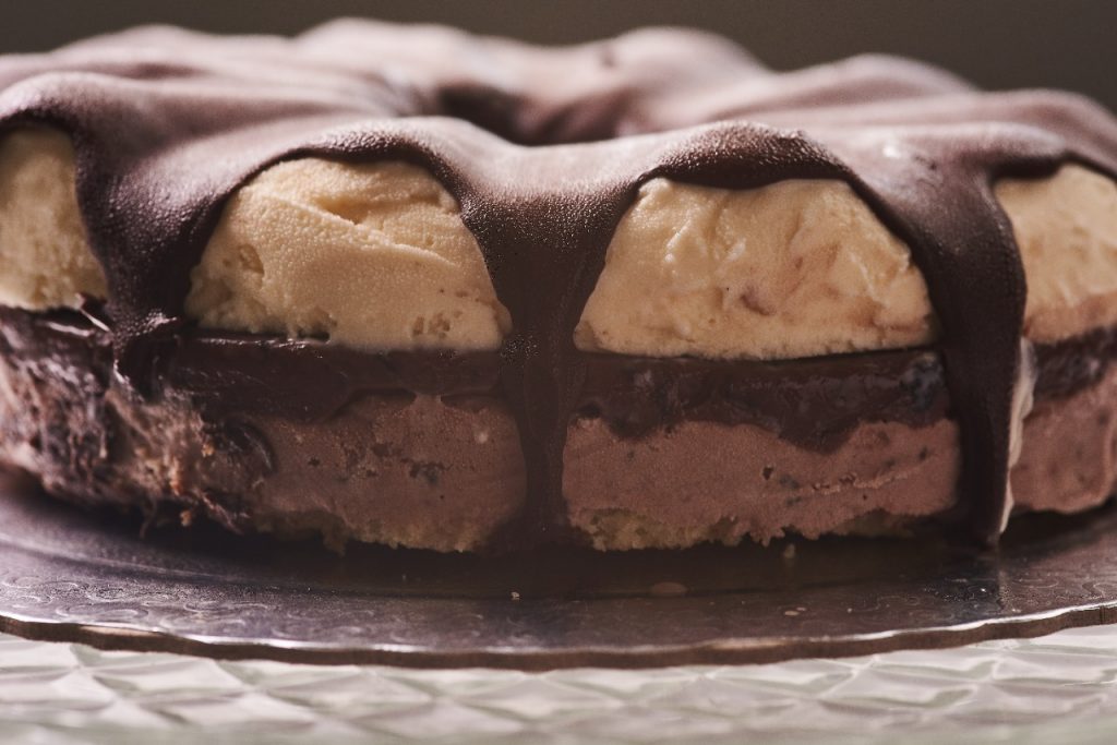 Torta de gelato de baunilha e chocoloate e recheio de frutas