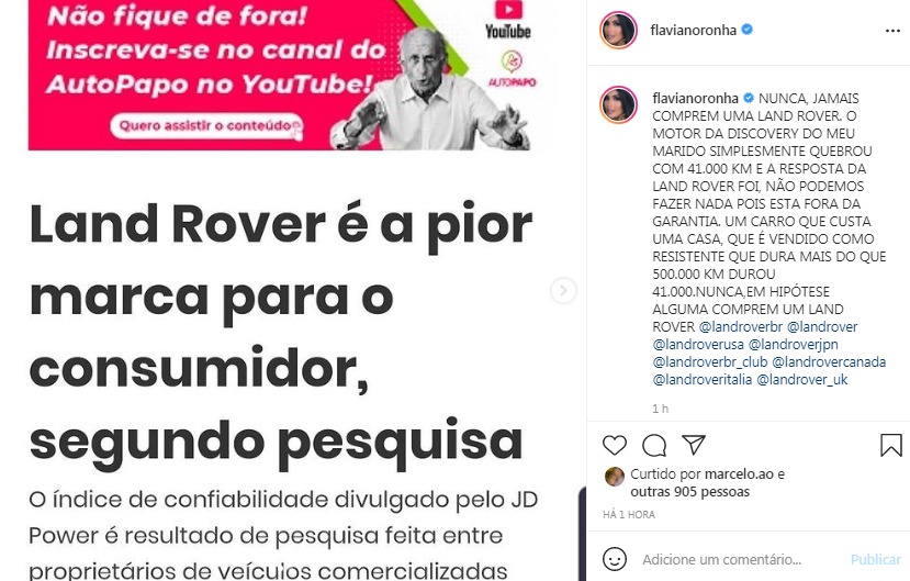 Junto com o relato, Flávia também publicou uma reportagem sobre uma pesquisa feita nos Estados Unidos. A matéria divulgou um estudo da JD Power, que revelou que a Land Rover é a pior marca para o consumidor.