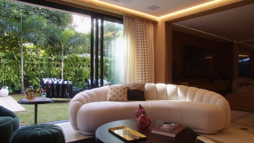 Um dos objetivos do casal era que a casa fosse acolhedora e para conquistar essa característica além de contar com a ajuda de Murilo, eles estiveram muito presentes em cada pequena escolha. “Desde o começo o Murilo teve a ideia da gente colocar os painéis de madeira, então, a casa inteira é uma caixa de madeira e eu acho que isso deixa o clima dela muito acolhedor. A gente tem uma ideia de continuidade no piso, então, o piso do pavimento térreo, ele se estende por toda a casa, área externa, desce na piscina, é tudo o mesmo piso. Conforme você vai subindo para as áreas íntimas o piso se transforma, então, é madeira de novo no chão, com acabamento de piso nas laterais, uma moldura de pedra, mas madeira no chão. E os banheiros, os banheiros são assim ‘uau’, porque a gente colocou mármore claro na parte da cuba e mármore escuro dentro do chuveiro, então, ficou muito lindo. Era uma coisa que a gente tava muito ansioso para ver o lavabo é maravilhoso, as pedras são belíssimas. Então, a gente teve muito cuidado para escolher as pedras corretas e os móveis a gente tinha também o mesmo cuidado desse clima, da ambientação. A gente pensou muito nos acabamentos, nenhum móvel a gente chegou na loja e falou ‘tá bom esse aqui do jeito que ele tá’, a gente pensou qual vai ser tecido, qual vai ser a textura, a minha filha ela ama textura, ela adora ficar passando a mão sofá, é muito interessante. A gente tem o boucle, tem veludo nos móveis, lá em cima tem o tweed, isso tudo dá uma interessância para o projeto. Embora, a gente tenha as linhas curvas que eu gosto muito, a gente tem outros móveis com linhas retas, para gente ter de tudo, eu acho que tem alguns contrastes que deixa a casa mais rica”, relata Gabriela.