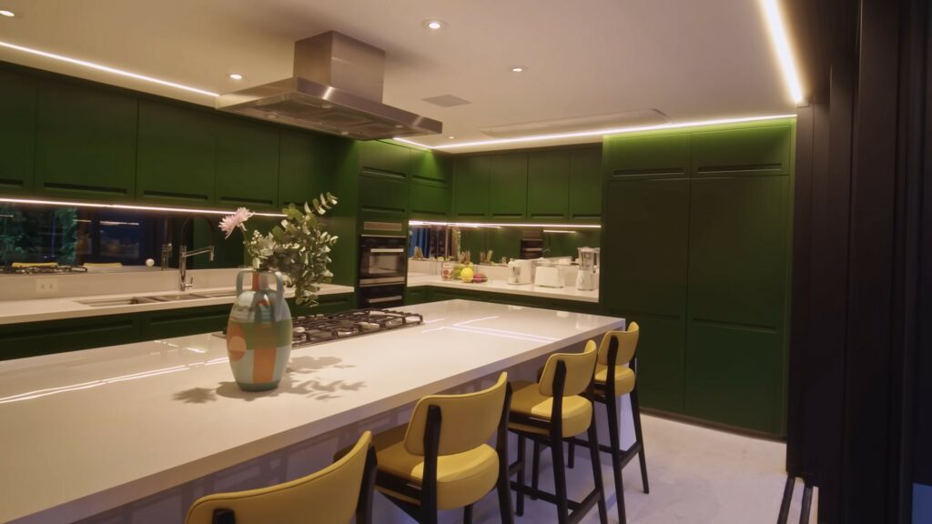 Uma das principais mudanças sugeridas por Murilo e aceitas pelo casal foi a troca da cozinha de local, no projeto inicial ela ficava onde hoje é a sala de televisão e atualmente ela fica junto da área externa da casa. “Ela forma um ‘L’ na continuação do jardim, que era justamente a integração que eu queria. Porque senão a gente tem o espaço gourmet com a churrasqueira, tudo mais e a piscina, se alguém está usando o espaço gourmet, você não consegue servir na bancada da cozinha porque ela está do outro lado, aí você tem que ficar passando os utensílios de um lado pro outro. Eu não queria isso porque essa era a configuração do nosso apartamento antigo, a gente morava numa cobertura, eu tinha a área externa, mas a gente usava muito pouco em virtude dessa falta de integração. Então, eu queria mesmo uma continuação e assim, a ideia de continuidade, ela é tão importante, que a gente decidiu pela cozinha verde, área gourmet verde juntando com muro de plantas. Então, é para que tudo pareça uma coisa só e para que as pessoas se sintam convidadas a desfrutar daquele espaço como um espaço único”, explica a advogada.
