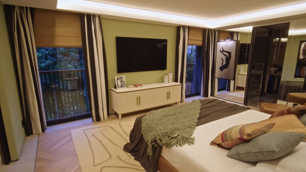 Outra mudança muito importante foi a transformação de dois quartos que viraram a suíte master, o cômodo conta com o quarto, o closet, o banheiro e uma linda vista. “Hoje a gente acorda abre a persiana e você vê uma pintura, é um quadro, você vê a copa das árvores, o verde, é muito legal. A gente tem gostos parecidos em alguns aspectos e a gente tem gostos diferentes em outros aspectos, mas a gente ter terceirizado pro Murilo dá a visão dele, porque quando você pega um artista e confia a ele um projeto você vai deixar o projeto na mão dele, porque você confiou essa responsabilidade a ele, já que você admira o trabalho e tudo mais. Então, foi muito legal que ele conseguiu mensurar, essa casa ficou um mescla do meu gosto com o gosto da Gabi, mas a curadoria foi feita por um terceiro, que foi o Murilo, caso não fosse assim, talvez não tivesse tão legal, porque eu ia tentar puxar para o meu lado, a Gabi pro dela”, enfatiza Thiago sobre a importância de Murilo.