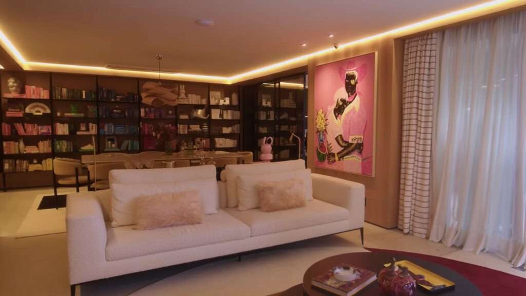 “Eu acho que a casa é a nossa cara. Então, você entra na casa e a primeira coisa que você vê é uma estante que preenche uma parede inteira com todos os meus livros misturados com a nossa história em fotos e em objetos, isso é maravilhoso e é um ponto alto da decoração. Quando você olha adiante, você encontra uma tela maravilhosa do Zéh Palito que dá vida à sala e é uma obra-prima. A gente ainda quer colocar mais arte na casa, mas a gente tá morando aqui faz pouco tempo e eu acho que arte é uma coisa de construção também, né? A gente não chega e compra por comprar, a gente entende a casa, entende o que a gente tá vivendo naquele momento e aí a gente vai transformando a casa para que ela reflita a nossas personalidades”, finaliza apresentadora.