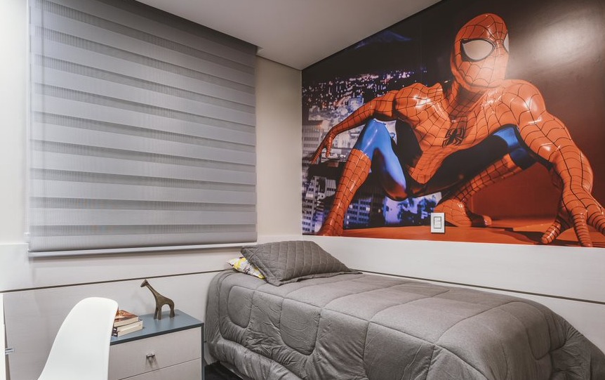 Neste projeto executado pelo escritório Meet Arquitetura, a arquiteta Flávia Nobre e a designer de interiores Roberta Saes inseriram o papel de parede do Homem-Aranha para quebrar a seriedade do quarto e trazer a personalidade e gosto pessoal do pequeno morador.