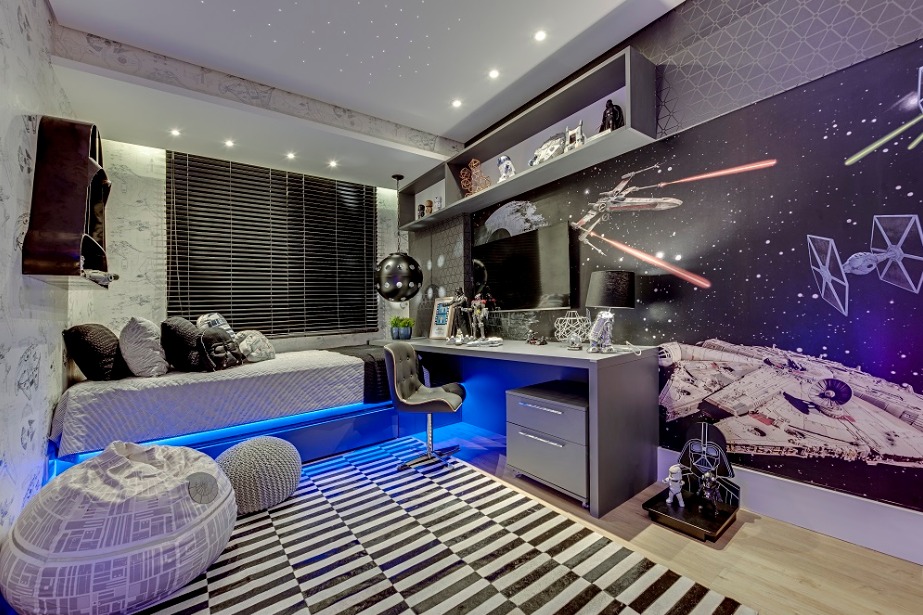 Neste projeto realizado pela arquiteta Carla Felippi, expert em criar espaços dos sonhos, a profissional trouxe diversos elementos do filme Star Wars para um cenário particular do morador com a marcenaria executada da SCA Santos.