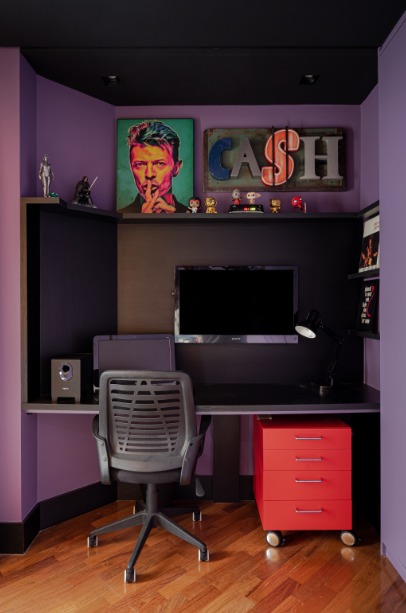 Neste projeto assinado pelo escritório Campiolo Arquitetura, a profissional Fernanda Campiolo inseriu cores fortes como o roxo e o vermelho, marcantes do geek. Além disso, o espaço de home office/estudo é marcado por colecionáveis do morador, como a figura do cantor e ator inglês David Bowie, que trouxe mais personalidade ao espaço.