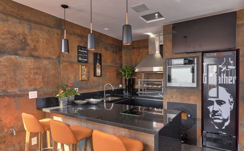 Para os mais discretos, essa varanda integrada com churrasqueira assinada pela arquiteta Cristiane Schiavoni traz um clima mais sofisticado, mas sem deixar o gosto pelo filme clássico ‘O Poderoso Chefão’ de lado.