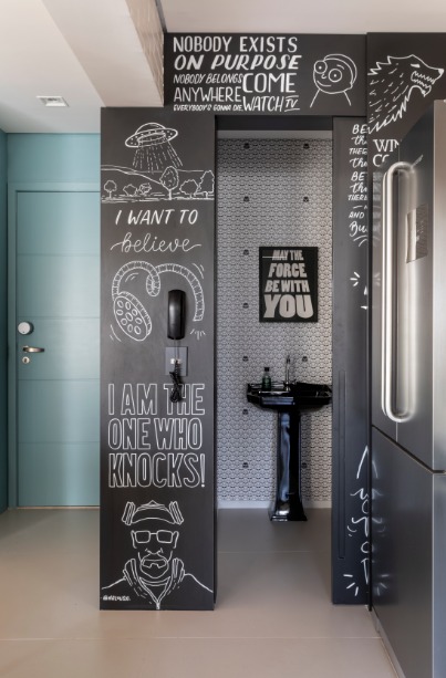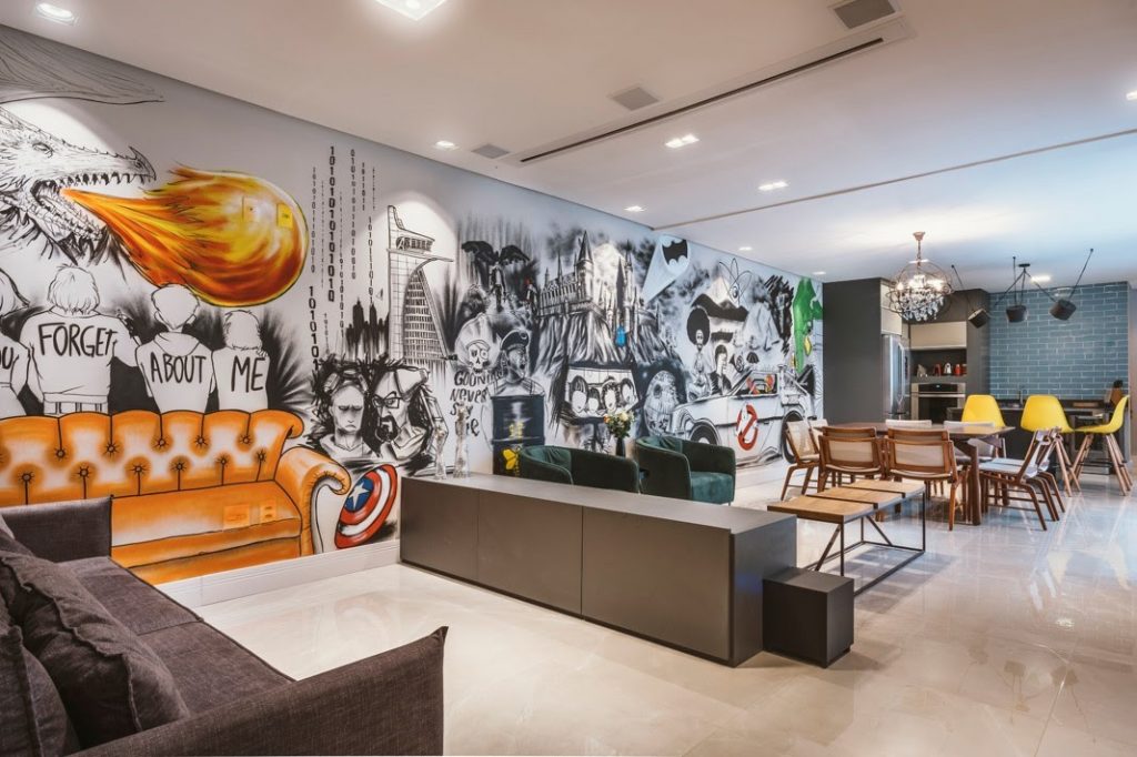 No amplo espaço integrado deste projeto do escritório PB Arquitetura, o grafite feito em toda a extensão da parede possibilitou a criação de inúmeros desenhos, a pedido dos moradores. Entre as ilustrações, várias referências à cultura pop. As obras são do artista Fernando Reche
