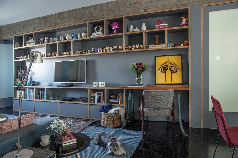 Neste projeto assinado por Aldi Flosi e Pati Cillo, a marcenaria foi projetada pela SCA Jardim Europa e expõe coleção de bonecos Funko do morador. Para completar o espaço, a luminária da Yamamura e a tinta Sherwin Williams trazem sofisticação o ambiente.