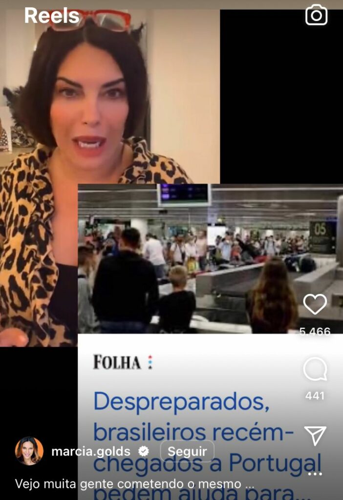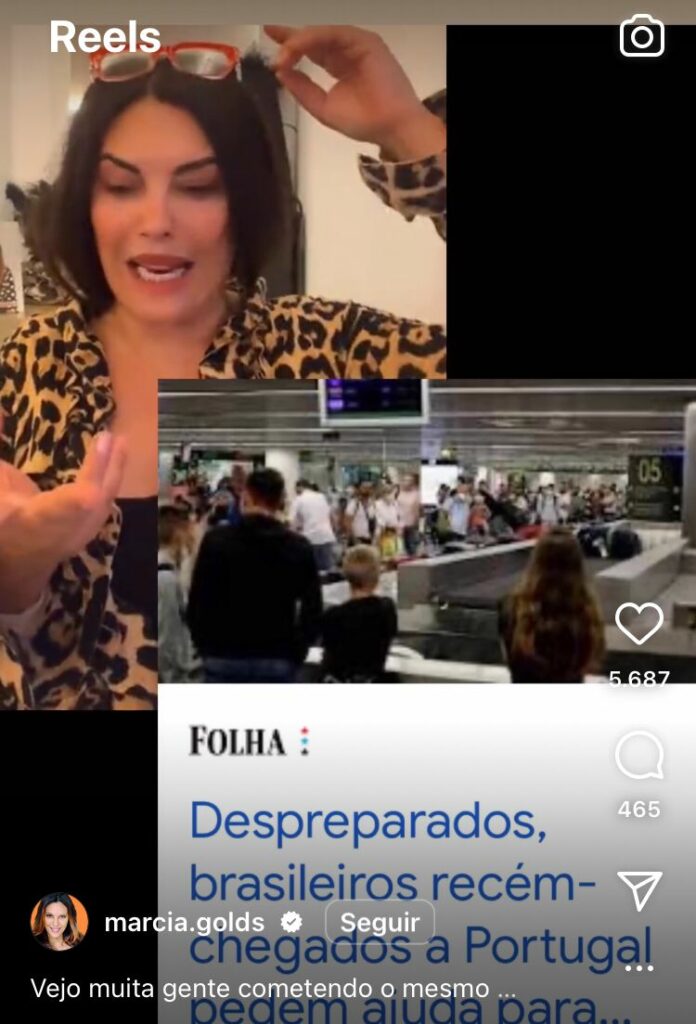 A apresentadora Márcia Goldschmidt, que mora em Porto desde 2010, publicou um vídeo nesta quarta-feira (23), em seu perfil no Instagram, comentando uma matéria publicada pela Folha de S. Paulo no dia anterior que aponta dados sobre brasileiros que vão morar em Portugal e decidem retornar ao Brasil por falta de oportunidades no país estrangeiro.