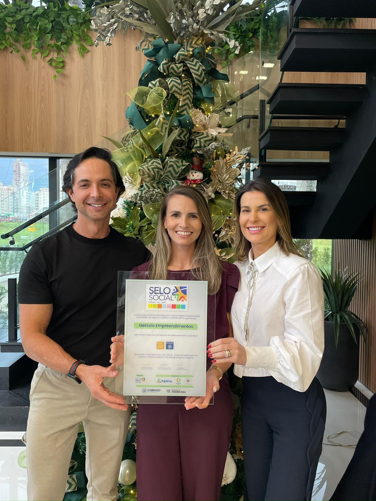 Priscila Jacomel entre os sócios João e Paula Gessele com o certificado Selo Social Itapema 2023 – Foto Divulgação