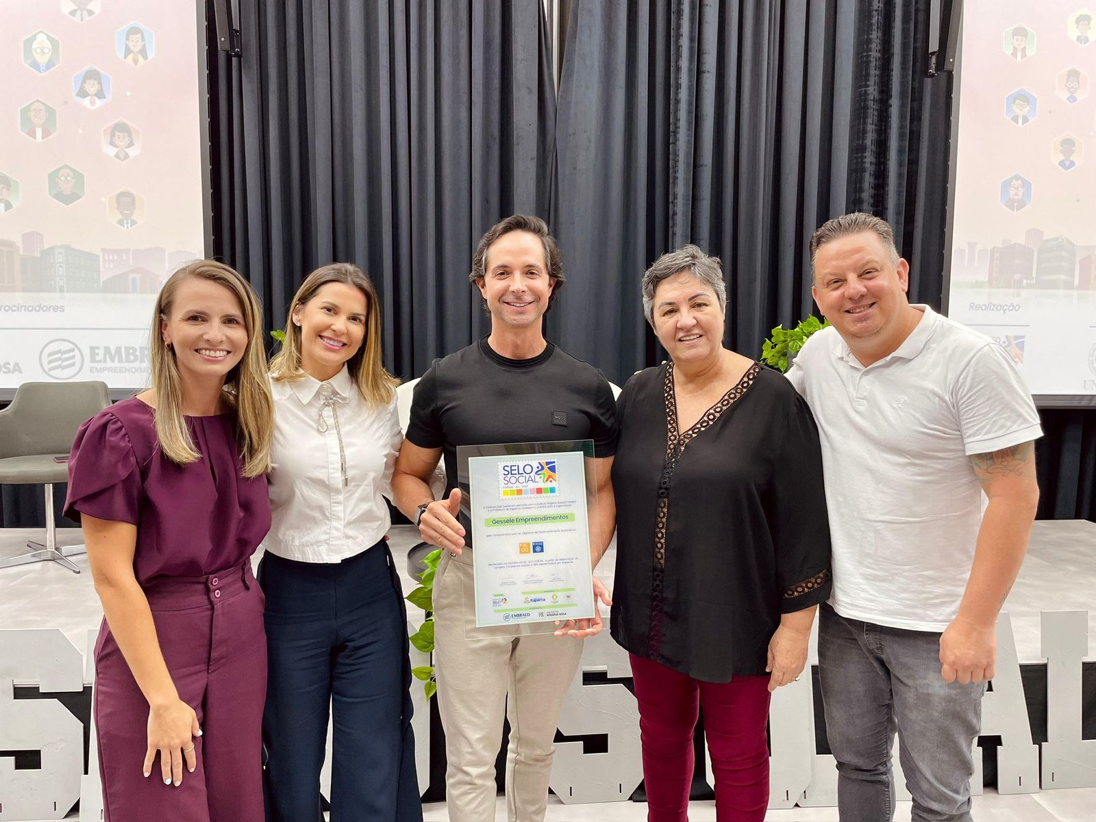 Paula Gessele (2ª à esquerda) e João Gessele (centro) recebem o Selo Social Itapema 2023 – crédito Foto Instituto Selo Social