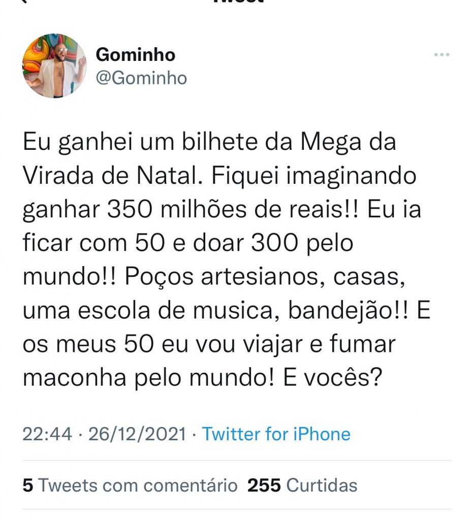 O apresentador Gominho polemizou e inspirou através de um post em seu Twitter (@gominho), no último domingo (26), contando o que faria caso ganhasse na Mega Sena da Virada, que será sorteada nesta sexta-feira (31).
