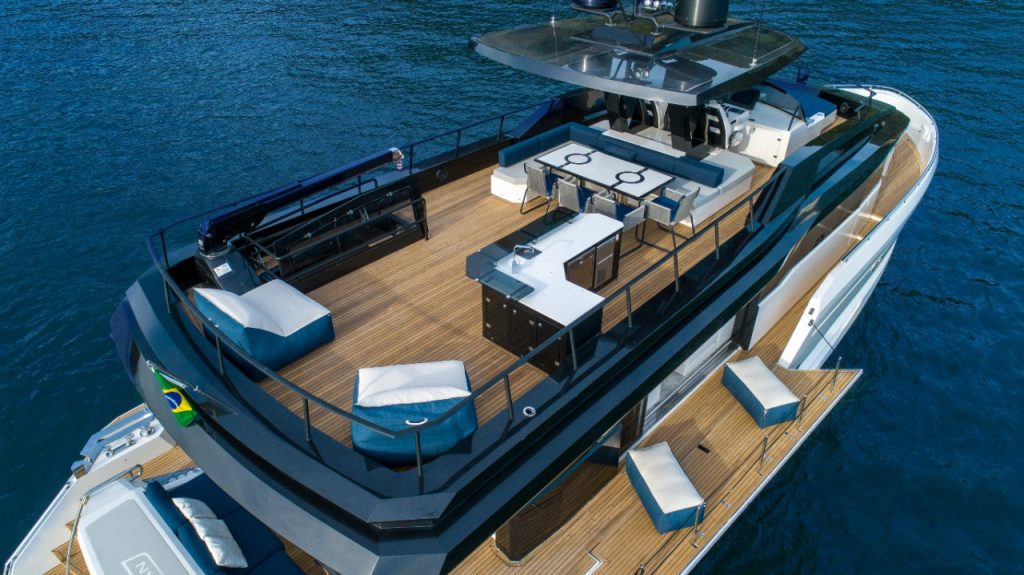 Ao todo, são 136m² de áreas externas ao ar livre, incluindo o flybridge (terceiro pavimento) que é um verdadeiro terraço sobre os mares