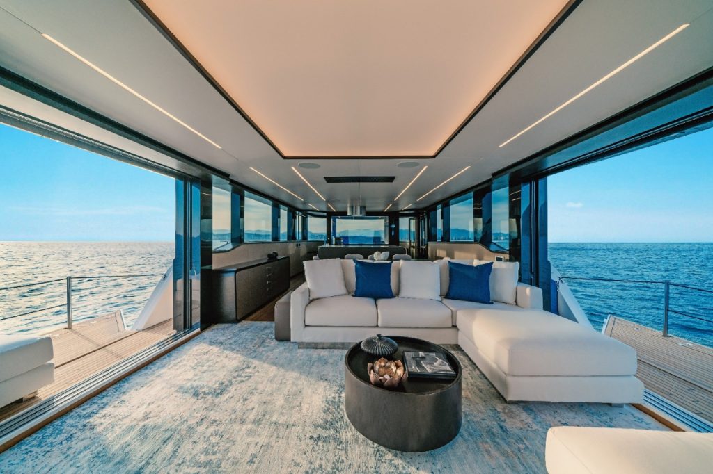 Outra característica do iate são as paredes envidraçadas que contornam o deck principal e permitem uma visão 360° do oceano