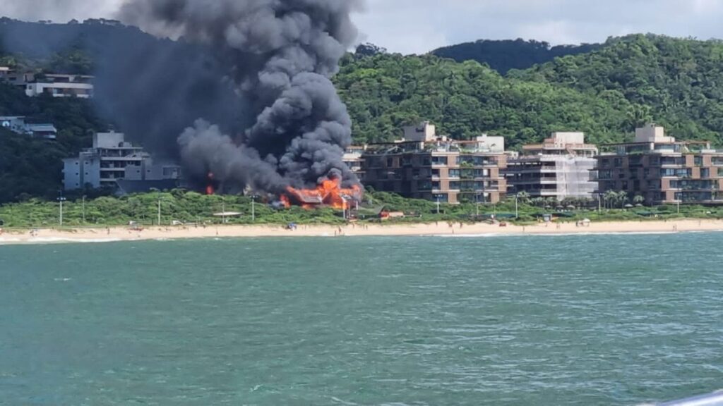 Um incêndio de grandes proporções atingiu o Warung Beach Club, na Praia Brava, em Itajaí, no Litoral Norte de Santa Catarina, na manhã desta quarta-feira (22).