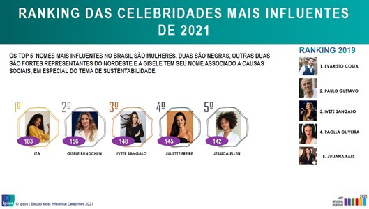 A cantora IZA foi considerada a celebridade brasileira mais influente do ano de 2021, de acordo com a terceira edição da pesquisa Most Influential Celebrities, realizada pela Ipsos. Em segundo lugar no ranking, ficou a top model Gisele Bündchen, seguida pela cantora Ivete Sangalo, pela vencedora da 21ª edição do Big Brother Brasil, Juliette Freire, e pela atriz global Jéssica Ellen, na quinta posição.