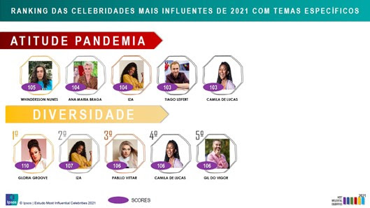 Estas últimas duas dimensões são estreantes nesta edição do Most Influential Celebrities. Considerando apenas o drive de Atitude Frente à Pandemia, as cinco celebridades que mais se destacaram foram: Whindersson Nunes, Ana Maria Braga, IZA, Tiago Leifert e Camilla de Lucas. Já na categoria Diversidade, os mais influentes foram: Gloria Groove, IZA, Pabllo Vittar, Camilla de Lucas e Gil do Vigor.